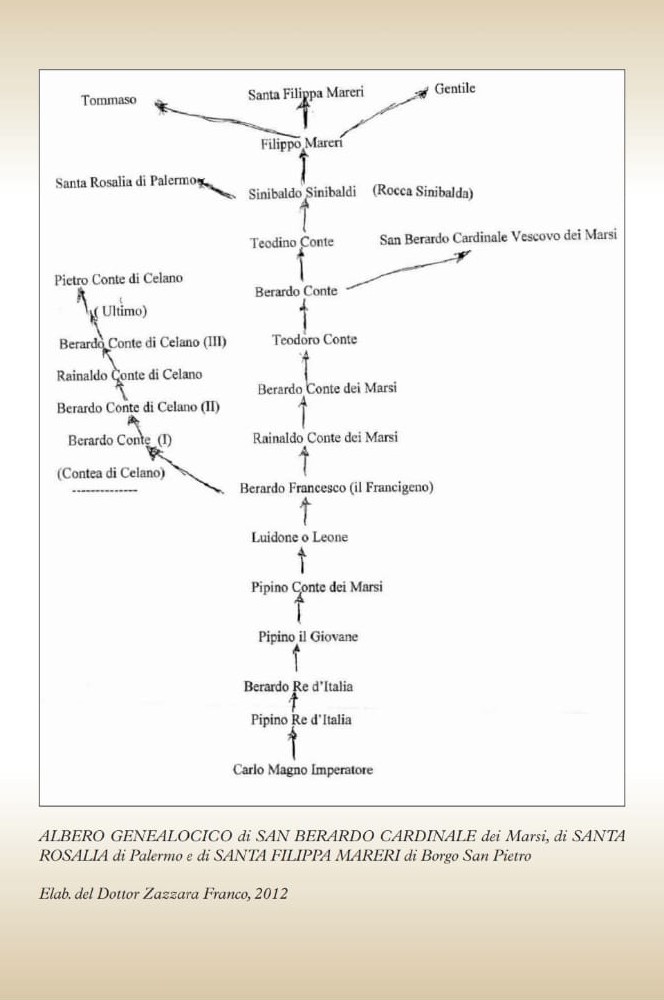 E allora con l’aiuto dell’albero genealogico di Santa Rosalia e di San Berardo dalla biblioteca del monastero dei Benedettini di Monreale (PA) e dell’elaborazione dell’albero di San Berardo, di Santa Rosalia e di Santa Filippa, disegnata da Franco Zazzara nel 2012, alberi che riportiamo entrambi, si può più serenamente pervenire ad alcune affermazioni. Ripartiamo come base d’ipotesi dal Castello di Rocca Sinibalda, dove era Conte Sinibaldo Sinibaldi o Sinibaldo dei Marsi.