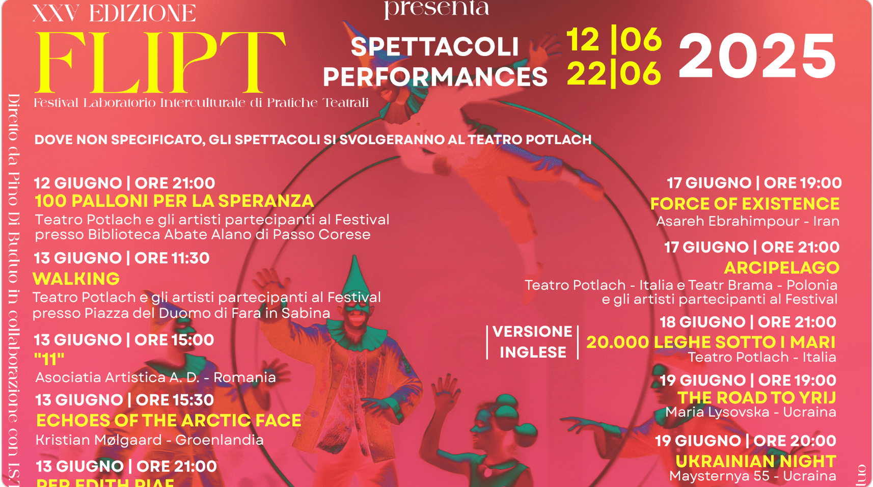 La XXV edizione del Festival laboratorio interculturale di pratiche teatrali, il FLIPT curato dal Teatro Potlach, sta affascinando cittadini e turisti a Fara Sabina. Dal 12 giugno, artisti provenienti da 18 paesi stanno animando la cittadina con laboratori, spettacoli e installazioni. Il festival proseguirà fino al 22 giugno, proponendo un ricco programma ispirato al tema dell’incontro tra culture e all’opera di Italo Calvino.