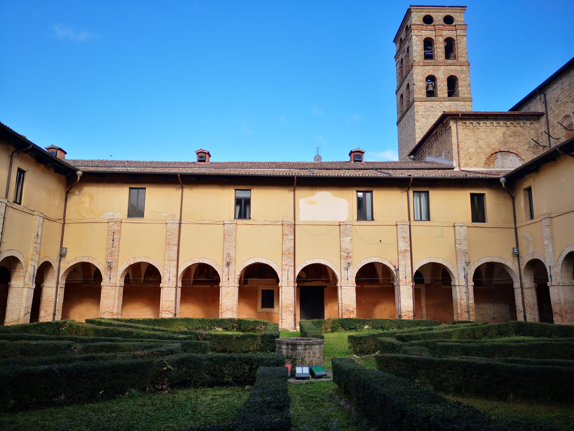 Dopo la visita della chiesa si entrerà in area militare all’interno della Caserma Verdirosi che comprende il convento domenicano e le sue varie parti, qui la prima sosta sarà nel chiostro della Beata Colomba, un antico cortile circondato da un porticato ad archi a crociera nelle cui lunette vi sono affreschi seicenteschi di noti autori reatini tra i quali il Manenti, al centro del cortile un pozzo circondato da aiuole con siepi di bosso tipiche dei giardini all’italiana.