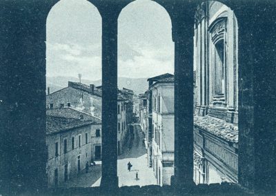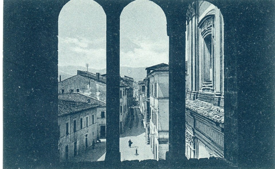 - Rieti, il rettifilo di via degli Abruzzi, oggi via Garibaldi, fotografato dall’interno del torrione di porta d’Arce