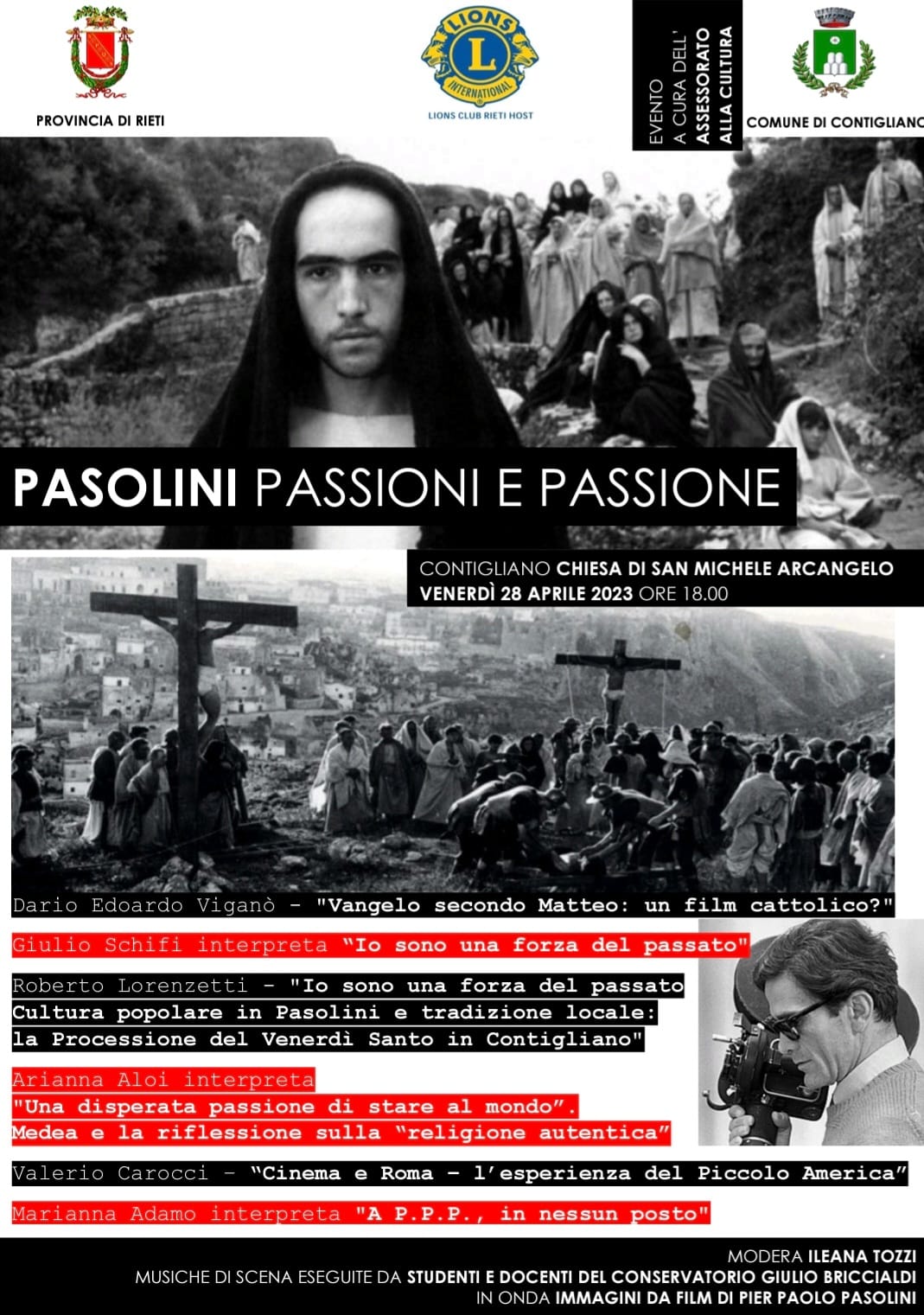 Con il patrocinio del Lions Club Rieti Host e della Provincia di Rieti e, il Comune di Contigliano – assessorato alla Cultura propone venerdì 28 aprile 2023 alle ore 18, nella Chiesa Collegiata di San Michele Arcangelo in Contigliano Alta, l’evento PASOLINI Passioni e Passione.