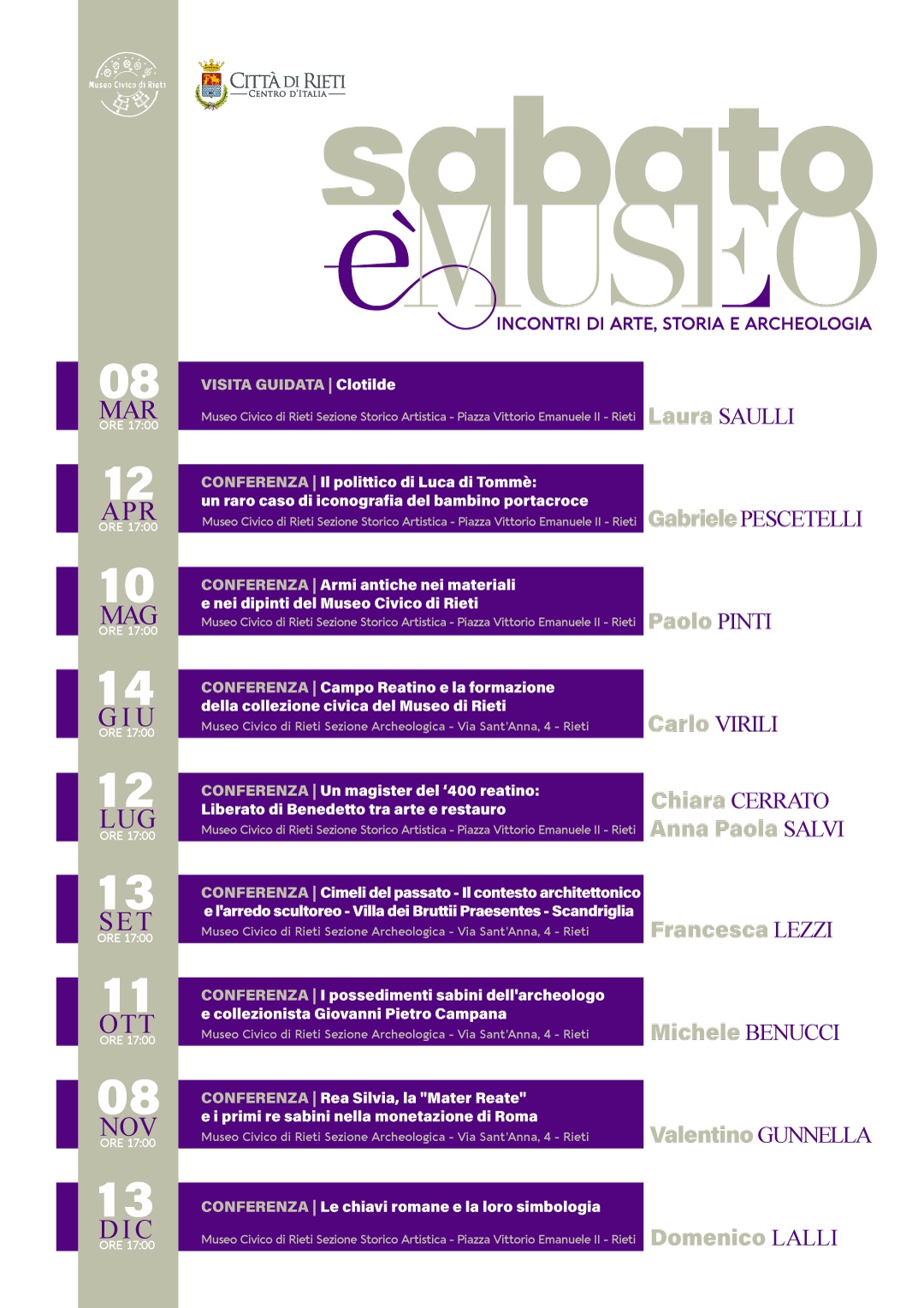 Con questo ciclo di appuntamenti il Museo Civico di Rieti vuole offrire a tutti coloro che si interessano di arte storia e archeologia, dei contenuti scientifici e delle tematiche di indagine che vedono coinvolti i beni del patrimonio della città.